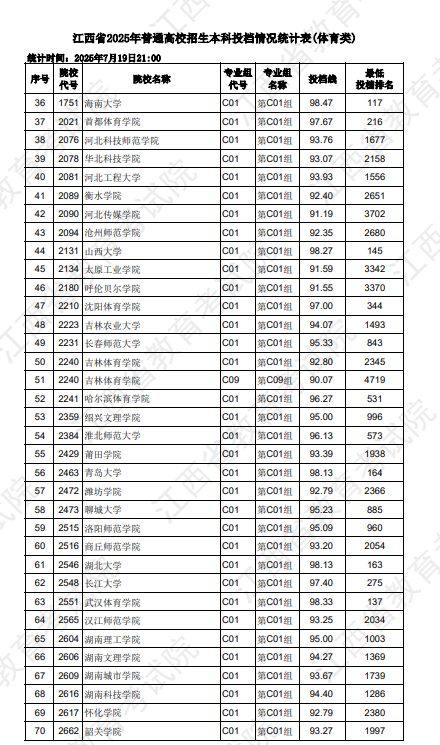 2025年江西体育类本科文化线为300分,专业线为89.79分;北京体育大学:物理类568分,对应位次大致在26659名左右;历史类565分,对应位次大致在6666名左右。上海体育大学:历史类565分,对应位次大致在6666名左右。