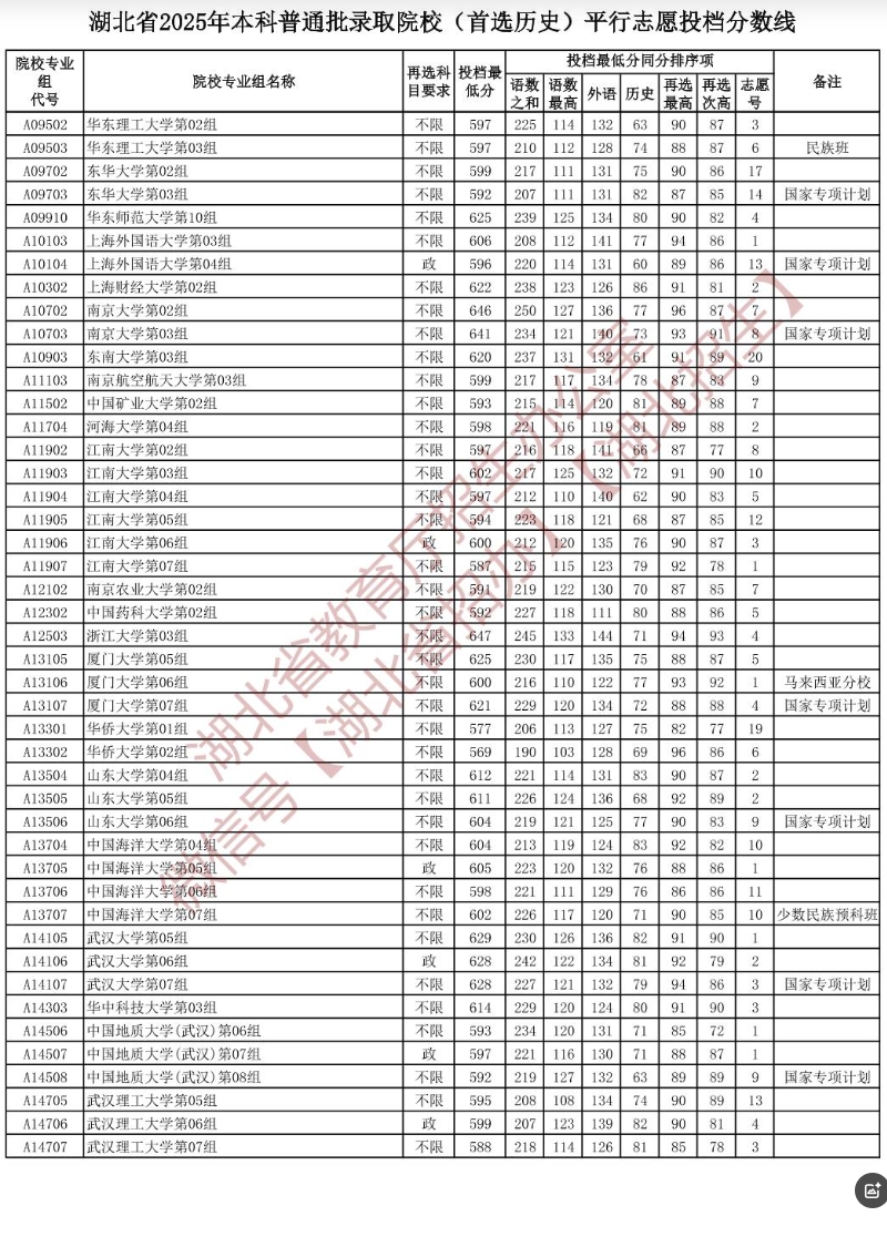 湖北省2025年本科普通批录取院校(首选历史)平行志愿投档分数线如下: