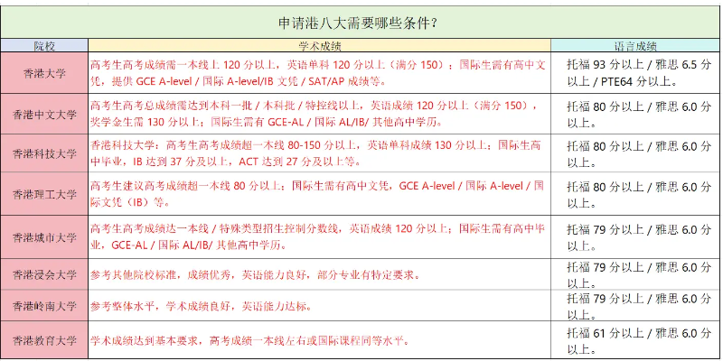 香港八大院校在亚洲乃至全球那都是响当当的,学术水平高,教学资源丰富,毕业生就业前景一片光明。可正因为太优秀了,申请难度大得超乎想象。想申请港八大,高考成绩至少得达到一本线以上,有些热门专业的分数线,甚至比985高校在当地的录取分数线还高。直接申请港八大,真的太难了。