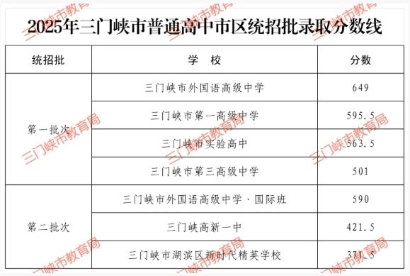从三门峡教育公众号了解到,2025年河南三门峡市普通高中市区统招批录取分数线已公布,其中第一批次三门峡市外国语高级中学录取分数线为649分,三门峡市第一高级中学录取分数线为595.5分。具体如下: