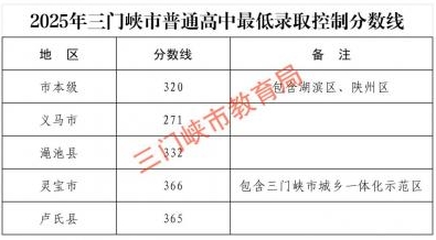 2025年三门峡市普通高中最低录取控制分数线公布。具体如下:三门峡市本级(包含湖滨区、陕州区)最低录取控制分数线320分;义马市最低录取控制分数线271分;渑池县最低录取控制分数线332分;灵宝市(包含三门峡市城乡一体化示范区)最低录取控制分数线366分;卢氏县最低录取控制分数线365分。