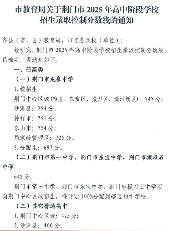 根据荆门市教育局发布“荆门市2025年高中阶段学校招生录取控制分数线”得知,2025年湖北荆门中考分数线已公布,其中荆门市龙泉中学在荆门中心区域统招分数线为747分。具体详情如下: