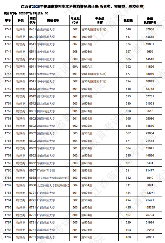 以下是江西2025年普通高校招生本科批次的投档情况统计表: