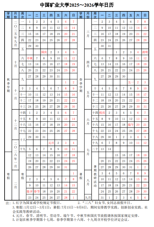 2025中国矿业大学校历如下: