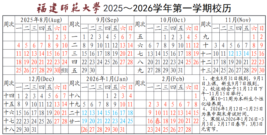 2025福建师范大学校历如下: