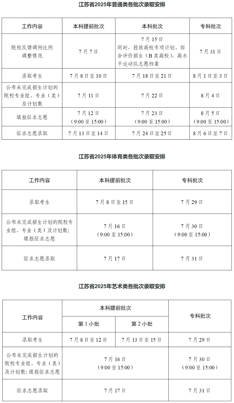 江苏高招录取工作分批次进行,考生要关注所报批次的录取时间安排。其中2025江苏专科批录取时间为:8月1日—7日。在高考录取期间,考生和家长要保持通讯畅通,以便及时接收招生院校的通知和咨询。