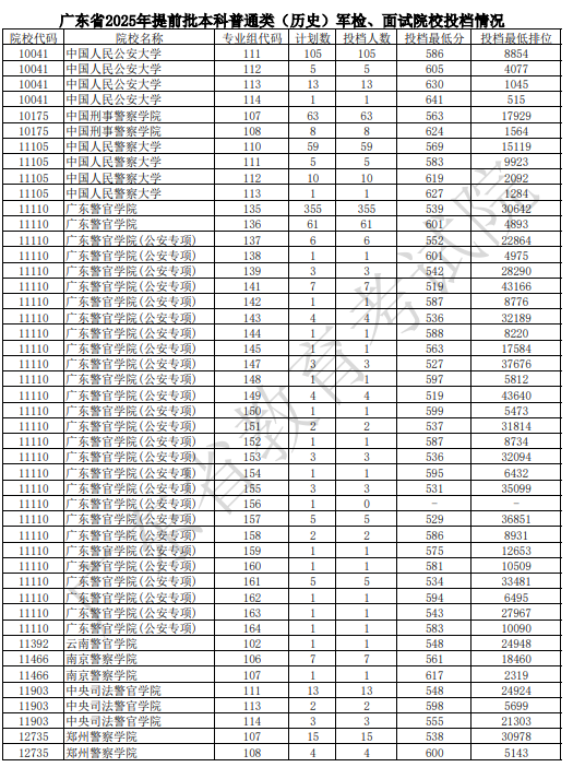 广东省2025年本科提前批普通类(历史)军检、面试院校投档分数线已经公布,军检院校共投出2656人,其中普通类(历史)投出801人,大部分院校已满档。军队提前本科批次院校(含空军、海军招飞、武警工程大学、武警警官学院)普通类(历史)的最低投档分数线为557分。