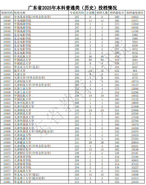 篇幅有限,下面仅展示全国高校在广东历史类录取分数线排名部分名单: