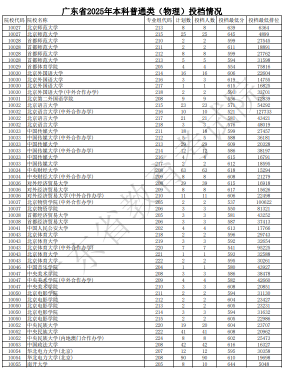 全国各高校2025在广东投档分数线公布!各本科大学录取分数范围是:历史类424分到675分、物理类425分到689分。最低分本科大学有广东技术师范大学(少数民族班)、福建商学院(本科预科班)等。