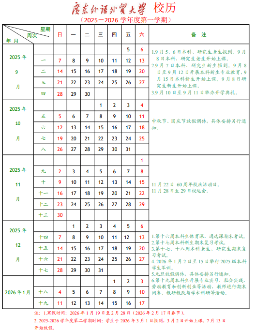 根据官网信息,2025年广东外语外贸大学开学时间:老生2025年9月5日(周五)至9月6日(周六);新生2025年9月7日(周日)。若因特殊情况无法按时报到,务必提前向所属学院提交书面请假申请,获批后方可延期,未经同意逾期未报到者,将视作自动放弃入学资格。